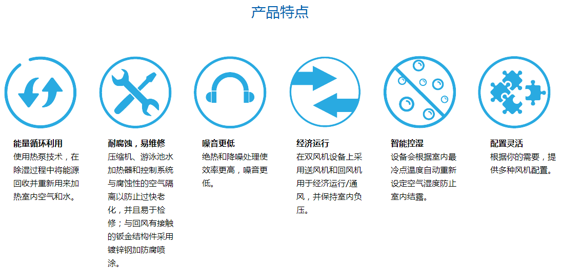 泳池除濕機的存在無疑是室內泳池的福音,一款好的泳池除濕能解決室內泳池的煩惱,如玻璃結露,天花滴水,空氣濕度大, 建筑結構的腐蝕,溫度和水溫難以控制等等問題.所以在泳池除濕機選擇上就顯得尤為重要了。